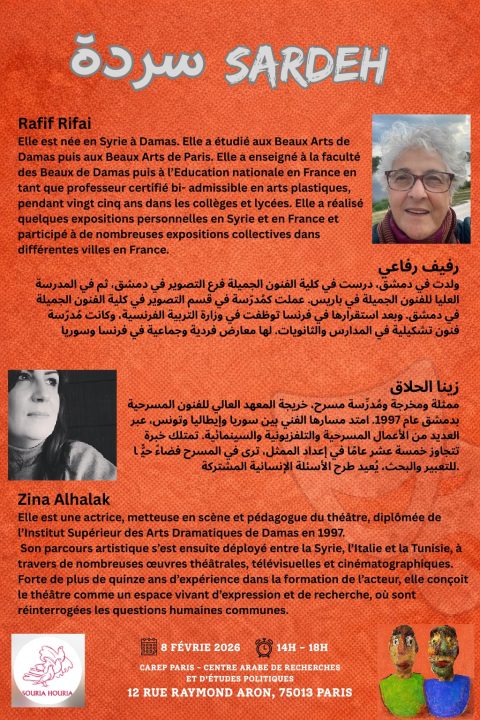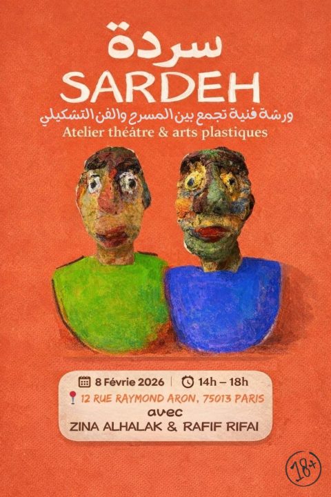 Souria Houria propose un atelier de pratique artistique pour adultes à partir de 18 ans, associant théâtre et arts plastiques.  Conçu comme une expérience collective, il est ouvert à toutes et à tous.